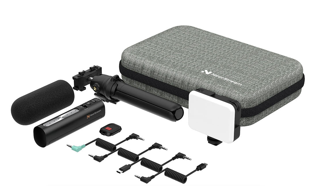 All-in-one premium video kit for content creators includes AM10B microphone, SL10B streaming light, tripod, carrying case and multiple cables.